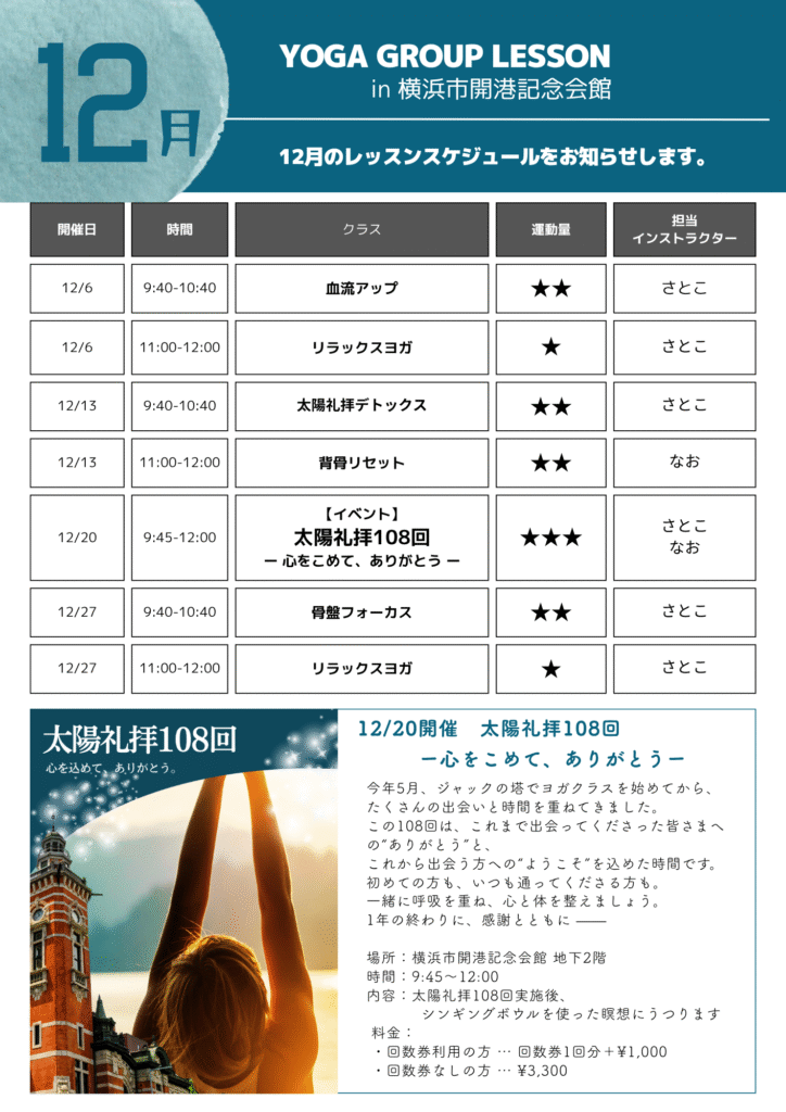 *ヨガマットは 1回200円で貸出も行っておりますが、数に限りがあるため先着順となります。あらかじめご了承ください。